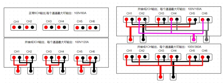 单机支持1、2、3、6 通道输出自由组合和主从并机,支持10台同型号的电源进行并机操作,以便用户实现更大功率扩展。并机操作时,主机自动合并显示参数,从机自动复制主机的设定参数,实现自动均流。