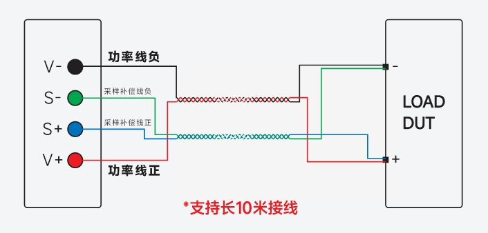 采用四线制接法,即两线用于输出电压,另外两端直接测量被测设备电压。通过SENSE端测量线能消除电池模拟器到DUT之间因引线电阻而引起的电压降。