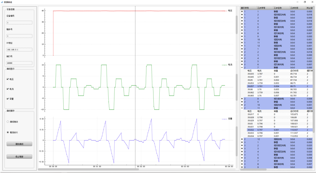 曲线种类 | X坐标:总时间,充放电容量,循环次数 Y坐标:总电压,电流,容量,单体温度,充放电终了容量和电压 | ||||||||||||||||